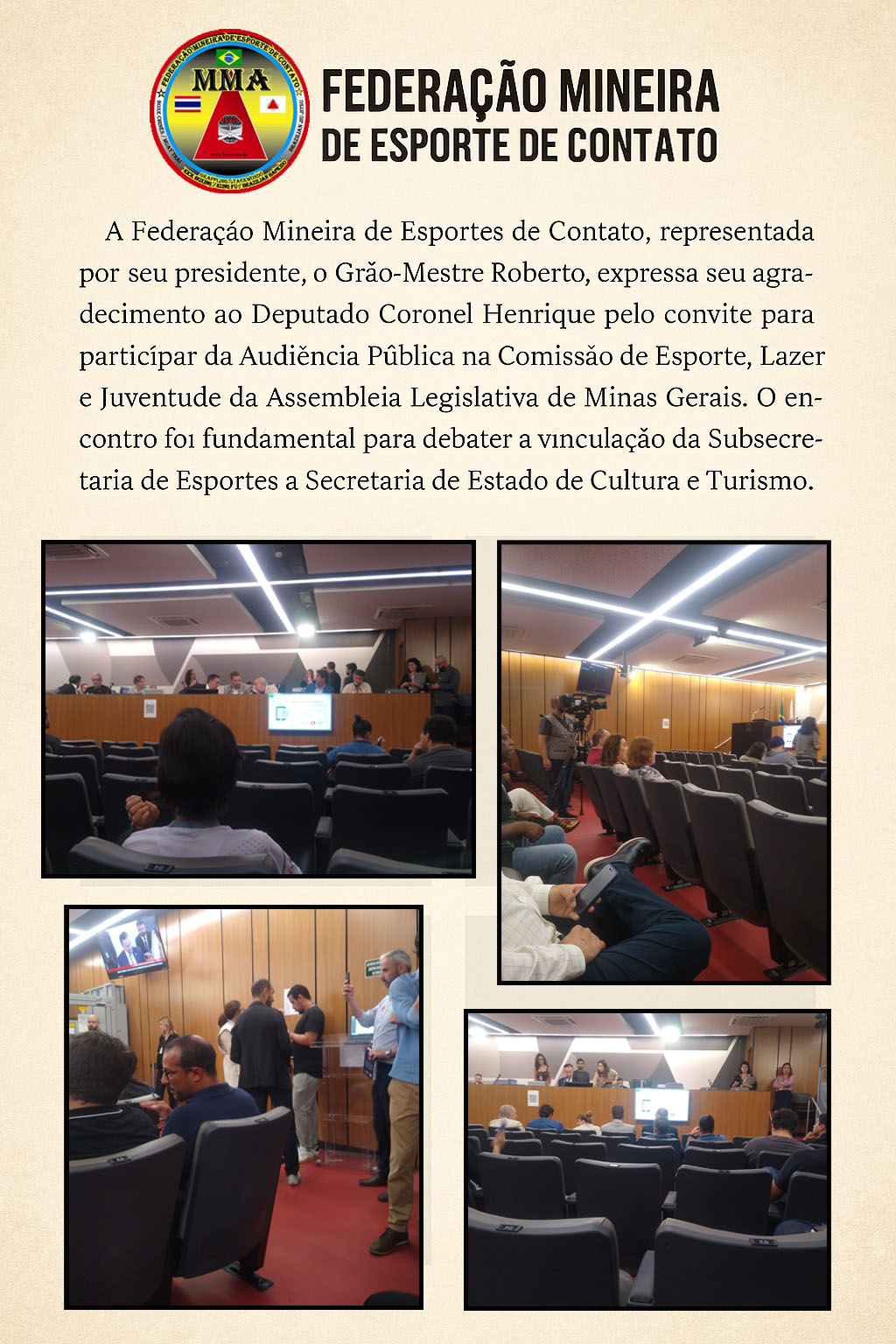 A Federação Mineira de Esporte de Contato, afiliada a CBAMECAP, representada por seu presidente, o Grão-Mestre Roberto, expressa seu agradecimento ao Deputado Coronel Henrique pelo convite para participar da Audiência Pública na Comissão de Esporte, Lazer e Juventude da Assembleia Legislativa de Minas Gerais. O encontro foi fundamental para debater a vinculação da Subsecretaria de Esportes à Secretaria de Estado de Cultura e Turismo.